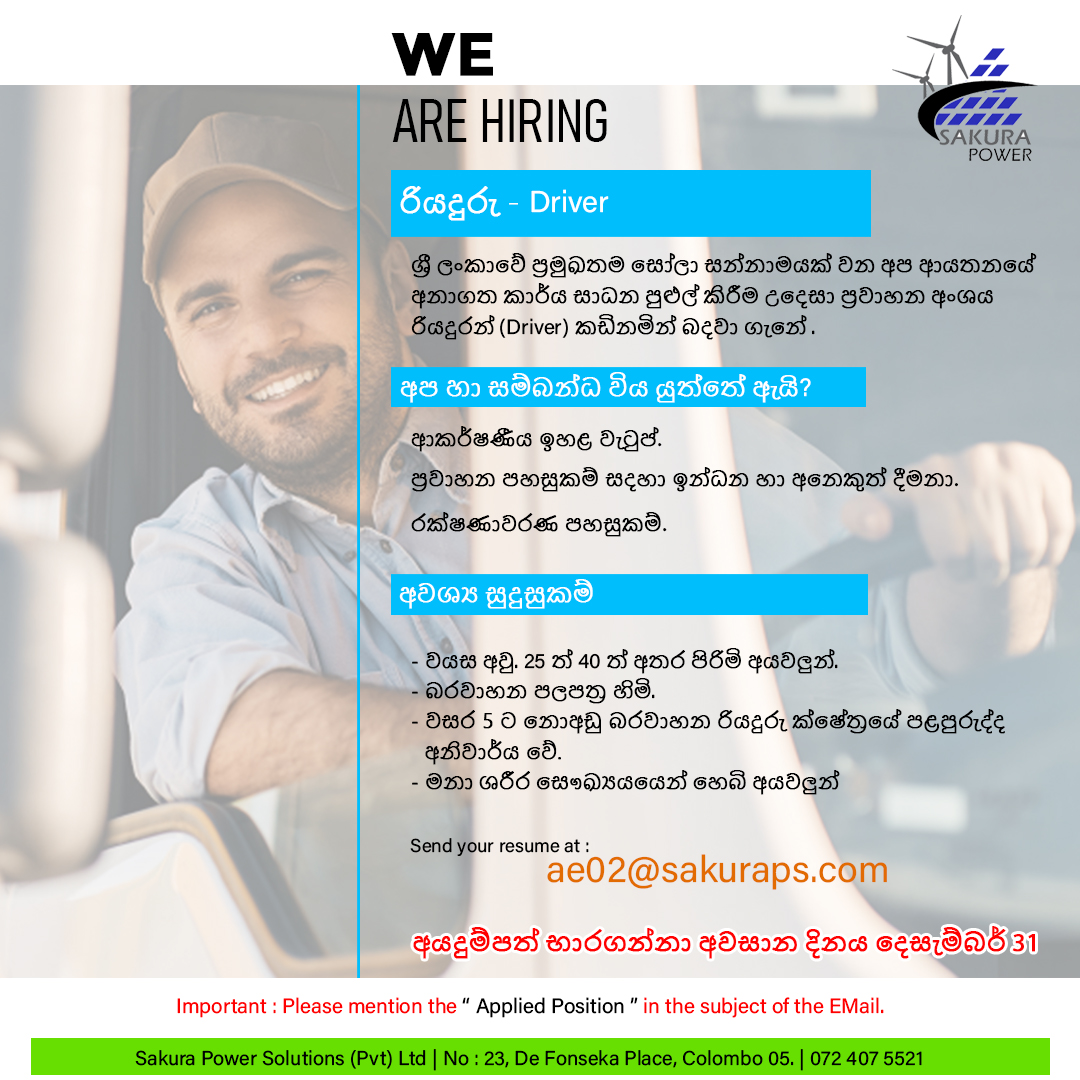 Join Sakura Power Solutions and be part of Sri Lanka’s renewable energy revolution. We’re looking for talented, driven individuals ready to power change - with innovation, teamwork and purpose. Let’s build a sustainable future together.